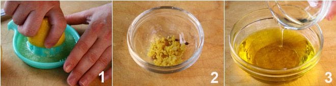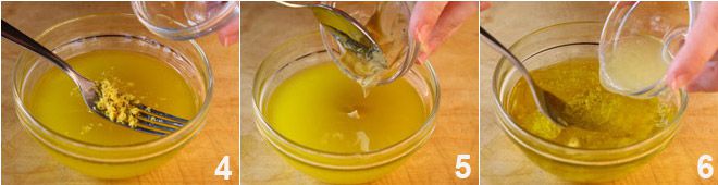 the grated lemon zest 4, mustard 5, lemon juice 6 and emulsify with a fork.