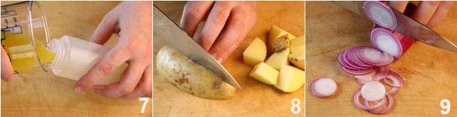 Then pour the glaze obtained into a squeezer 7 and let it rest in the refrigerator. Meanwhile, cut the potatoes into quarters 8 and thinly slice the Tropea onion 9.