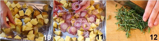 Place the potatoes in a disposable aluminum container, then add the potatoes 10 and the onion 11. Finely chop the rosemary 12,