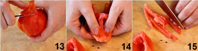 then peel the tomatoes 13, remove their seeds 14, and cut them into strips 15.