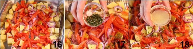 Add the tomatoes to the potato tray 16, then add the chopped rosemary 17, lemon juice 18