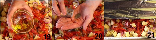 drizzle with oil 19, add pepper and salt 20 and mix well. Then cover the tray with a sheet of aluminum foil and place it on the grill and let cook for 25 minutes at medium-high heat 21.