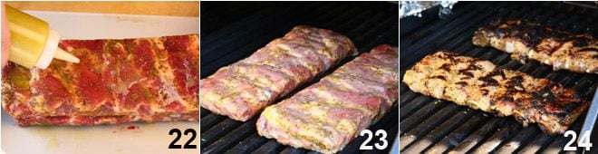 Then proceed with the preparation of the ribs, drizzle them with a thin layer of citrus glaze 22, and grill them directly on the coals 23 until a crispy crust forms on the surface 24, which will take about 5 minutes. Then move the ribs to the cool side of the barbecue, add the pre-moistened hickory chips to the coals, and smoke for about 30 minutes.