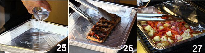 Then pour a couple of tablespoons of water into an aluminum tray 25, place the ribs 26, cover with aluminum, and continue cooking indirectly for another 30 minutes. Once the desired consistency is reached, put the ribs back on the grill for a couple of minutes to dry them out. Brush again with the glaze and serve with potatoes that should have a crunchy texture 27.