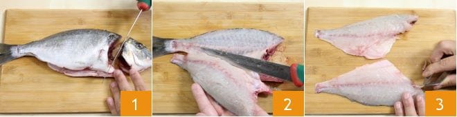 To prepare the couscous with vegetables and fish balls, start by boiling a potato. Then focus on cleaning the sea bream: for best results in this delicate operation, consult our Cooking School: How to clean the sea bream. After gutting and scaling the sea bream, remove the gills. Use a fish filleting knife to cut the head off 1. Continue by cutting the tail and the dorsal part of the fish along the spine: start from the top and move the blade horizontally in relation to the work surface to obtain the first fillet 2. Separate the two halves of the fish and continue in the same way, detaching the meat from the bone to obtain the second fillet (be careful not to remove too much pulp during this operation). Remove all any bones using a tweezers 3, then locate them by running a hand over the pulp, then carefully remove the skin using the knife to avoid wasting the fish meat.