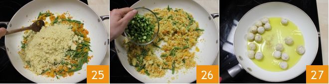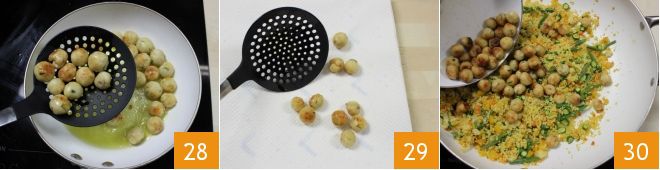 The cooking will be rather quick, the fish balls only need to brown. When the surface is golden, drain them with a skimmer 28 and let them dry on a tray covered with absorbent paper, to remove excess oil 29. Once dry, add the fish balls to the pan with the couscous and vegetables 30.