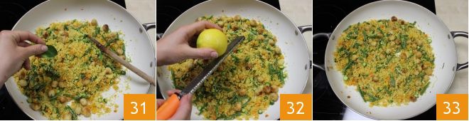 Season everything by adding a few mint leaves 31 and grating the zest of half a lemon 32. Mix and your couscous with vegetables and fish balls is ready to be served 33!