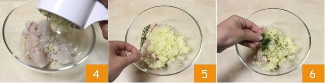 Cut the sea bream pulp into pieces and transfer it to a bowl; you'll need 260 g. Once the potato is boiled, peel it and crush it directly into the bowl with a potato masher 4. Salt and pepper to taste, then add the thyme leaves and chopped parsley (5-6).