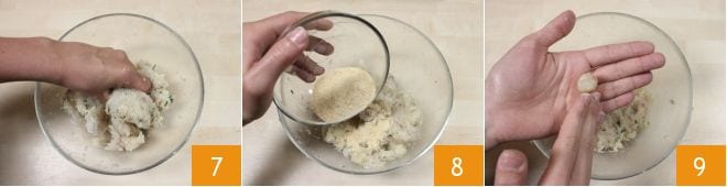 Knead the mixture by hand 7, add the breadcrumbs and work again 8. Then form meatballs of about 5 g each 9.