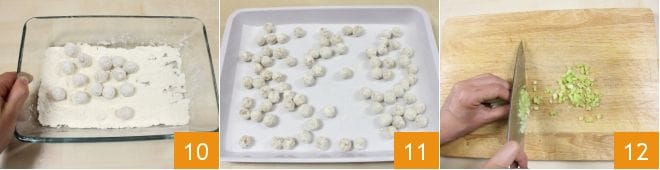 Put some flour in a bowl and flour the meatballs 10. Then transfer them to a tray and store them in the fridge until you fry them 11. Now prepare the vegetables for the couscous: start by thoroughly washing the celery and finely chopping it 12.
