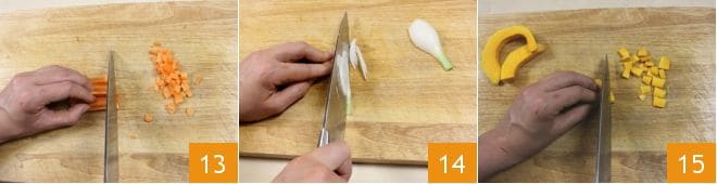 Wash and peel a carrot with a peeler and chop it 13, clean a fresh scallion and slice it 14. Then remove the skin and seeds from the pumpkin and cut it into cubes 15.