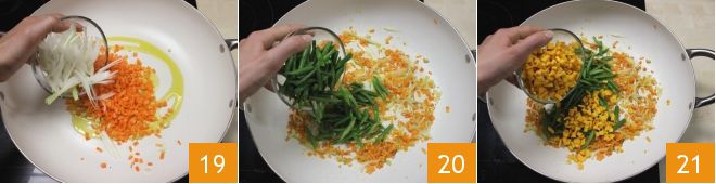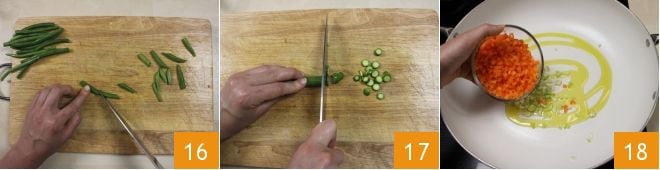 Thoroughly wash the green beans under running water, remove the ends and divide each bean into three pieces 16. Finally, slice the baby zucchinis into rounds after washing and drying them 17. At this point, take a large non-stick pan, pour a drizzle of oil and add the chopped celery and carrots 18.