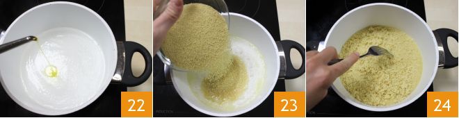 Now focus on the couscous: fill a large pot with water, salt it, and add a drizzle of oil 22. Once it boils, pour in the couscous 23 and let it cook for 5 minutes with a lid on. After this time, the couscous will have absorbed most of the cooking water, doubling in volume 24.