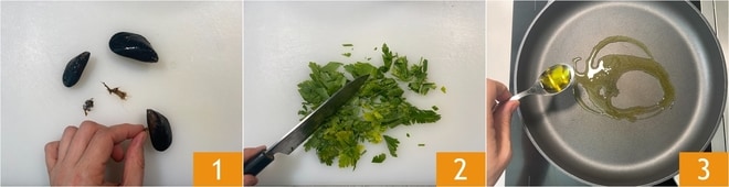 To prepare mussels marinara, first take care of the How to Clean and Open Mussels. Remove the beard and rinse them 1. Finely chop the washed parsley. Pour the oil into a high-edge pot 3.