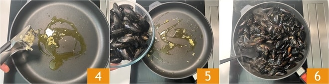 Add the whole garlic, or crush it with the appropriate tool 4. Heat, let it flavor, and add the mussels 5. Stir 6 and keep the heat medium-high.