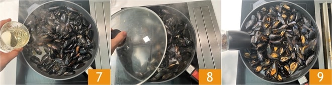 Deglaze with white wine 7 and let the alcohol evaporate, then cover with a lid 8 and cook for about 5 minutes until they are all open. Occasionally shake the pot, without removing the lid, to facilitate opening. At this point, add the black pepper 9.