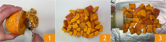To prepare the creamy pumpkin and quartirolo risotto, first wash the pumpkin, then remove the seeds and internal fibers 1 and cut the flesh into cubes without peeling it 2. Place them on a sheet of aluminum foil and season with oil 3.