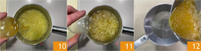 When the butter turns amber and the onions are wilted, add the white wine 10 and vinegar 11. Let it cook for a few minutes, then filter through a sieve 12 and place everything in the refrigerator to let it solidify.