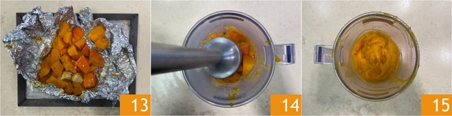 When the pumpkin is ready 13, transfer it to a jar, remove the garlic cloves, and blend with an immersion mixer 14 until you get a smooth and silky puree 15.