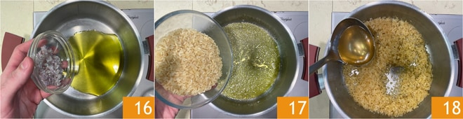 In a pot, add the oil and the finely chopped shallot 16 and let it brown. Pour the rice into the pot 17 and toast for a few minutes. Moisten with the vegetable broth 18. Cook the rice by adding a ladleful each time the previous one is absorbed.