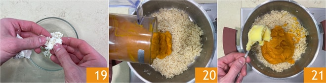 Meanwhile, roughly break up the quartirolo 19. When the rice is cooked, add the pumpkin cream 20 and cold acid butter 21.