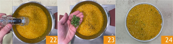 Add pepper 22 and marjoram 23. Let the risotto rest for a few minutes and then plate 24.