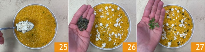 Add the quartirolo on top of the risotto 25. Garnish with toasted pumpkin seeds 26 and a few marjoram leaves 27. Your creamy pumpkin and quartirolo risotto is ready to be enjoyed!