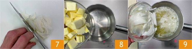 To make the acid butter, first slice the onion into julienne strips 7. Melt the butter in a small saucepan 8 and add the onion 9.