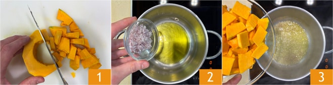 To prepare the creamy vegan meatballs, first make the vegetable broth following our recipe. Clean the pumpkin and cut it into cubes 1. In a pot, pour the oil, add the shallot 2, and sauté for a few minutes. Then add the pumpkin 3.
