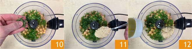 Add the thyme 10, nutritional yeast 11, and oil 12.