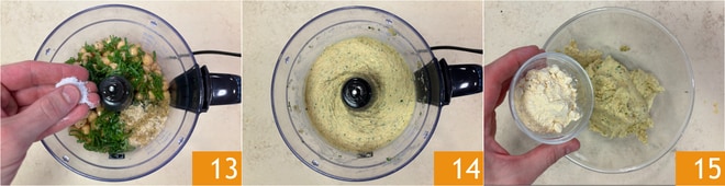 Season with salt 13 and pepper, then blend until you obtain a homogeneous mixture 14. Transfer everything into a bowl and add chickpea flour 15.