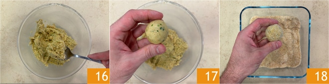 Mix until you obtain a moldable dough 16. Form the meatballs 17 and roll them in breadcrumbs 18.