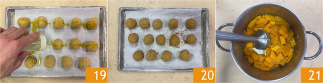 What makes them special is the balance between the delicacy of the pumpkin cream and the bold character of the baked chickpea meatballs. A harmonious and colorful dish to be served for a family lunch or a dinner with friends, whether vegetarian or not.