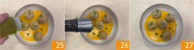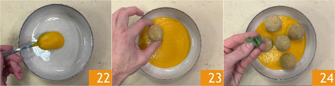 You are ready to plate: spread the pumpkin cream on the bottom of the plate 22, then place the meatballs 23 and a few marjoram leaves 24.