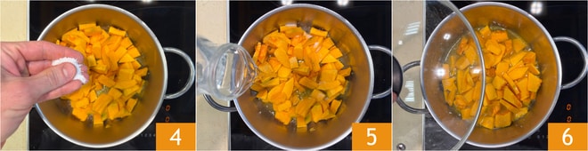 Season with salt 4 and pepper, then flavor with thyme and bay leaf. Cover with vegetable broth 5, close with a lid 6, and cook over medium heat for about 20 minutes until the pumpkin becomes soft.