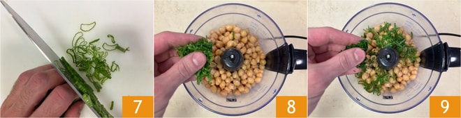Meanwhile, finely chop a scallion 7 and place it in a mixer 8 along with the chickpeas and chopped parsley 9.