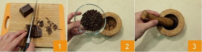 To prepare the coffee cream, chop the dark chocolate with a knife 1 and set it aside; place the coffee beans in a mortar 2 and crush them rather coarsely 3;