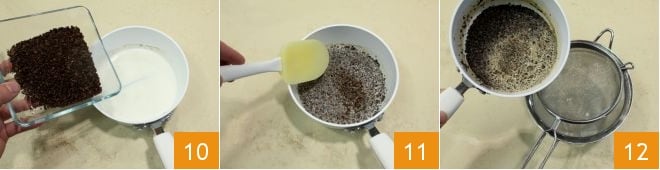 and add the coffee beans 10. Stir with a spatula, let it cool 11, then strain the milk and coffee with a fine mesh sieve 12.