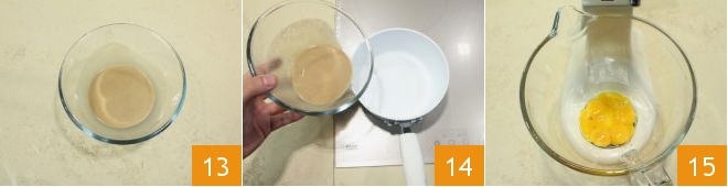 Take the milk you have obtained 13 and heat it again 14. In the bowl of a stand mixer with whisks, place the egg yolks 15