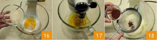 along with the brown sugar 16. Work everything with the whisks 17, then add the sifted cocoa 18