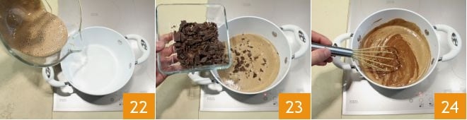 Heat the mixture you have obtained 22 with the chopped dark chocolate you set aside 23 and stir with the whisks over low heat 24 for a few moments.
