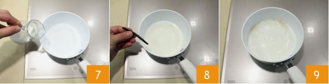 In a separate saucepan, heat the milk 7 together with the vanilla pod 8. When the milk reaches boiling 9, remove it from the heat