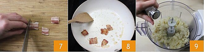 Cut each slice of bacon into 3 pieces about half an inch wide 7 and sauté them in a pan for a few seconds over high heat with a drizzle of oil 8. When the bacon becomes crispy, turn off the heat and set it aside. In a mixer, place the now cold cauliflower, season with salt, add the pepper 9