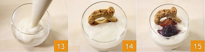 Now assemble the glasses: transfer the cauliflower cream into 12 glasses (you can do this with a pastry bag if you prefer), 13 and garnish each glass with a torcello 14, a slice of crispy bacon, and the caramelized onion 15. Now, the cauliflower cream with torcello is ready to be served!