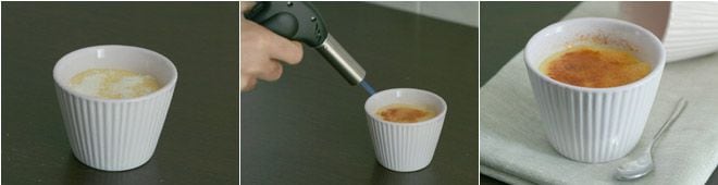 Let it rest in the fridge until serving time, then remove the plastic wrap, sprinkle the surface with sugar, and caramelize it with a gas torch until the sugar becomes golden and crunchy.