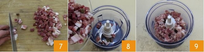 Cut the smoked bacon into cubes as well 7. Add both the ham and bacon to a mixer and blend 8: the chopped cubes should be fine 9 but not completely mashed. Temporarily set aside.