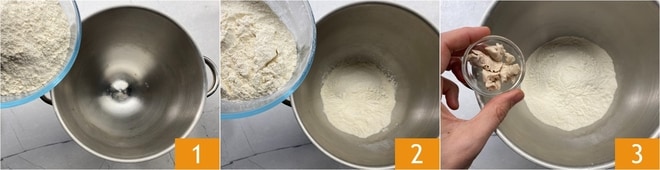 To prepare the crescentine (or tigelle), place the all-purpose flour 1 and the cake flour in the bowl of a stand mixer 2, then add the fresh yeast 3.