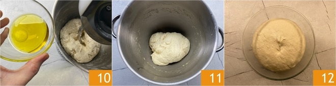 After about 10 minutes, the dough will be uniform, so you can also pour in the oil slowly 10. Let the mixer work for another 5 minutes. If it still seems sticky, stop the machine and let the dough rest covered for 5 minutes. When the dough is smooth and elastic 11, let it rise at room temperature for 3 hours or until it doubles in size, in a bowl covered with plastic wrap 12.