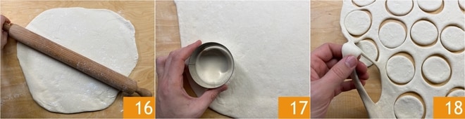 After the rising time, lightly flour both the work surface 13 and the dough 14 and start rolling it out with a rolling pin 15. If it springs back a lot during rolling, wait a few minutes to allow the dough to relax.