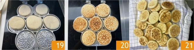 You're ready for cooking: heat your tigelliera, place the tigelle in the compartments, and cook for 5 minutes on each side 19. Once they are golden and have the typical floral design 20, transfer them to a tray lined with a towel 21 and cover them with it: this way they will remain soft inside and crispy outside.